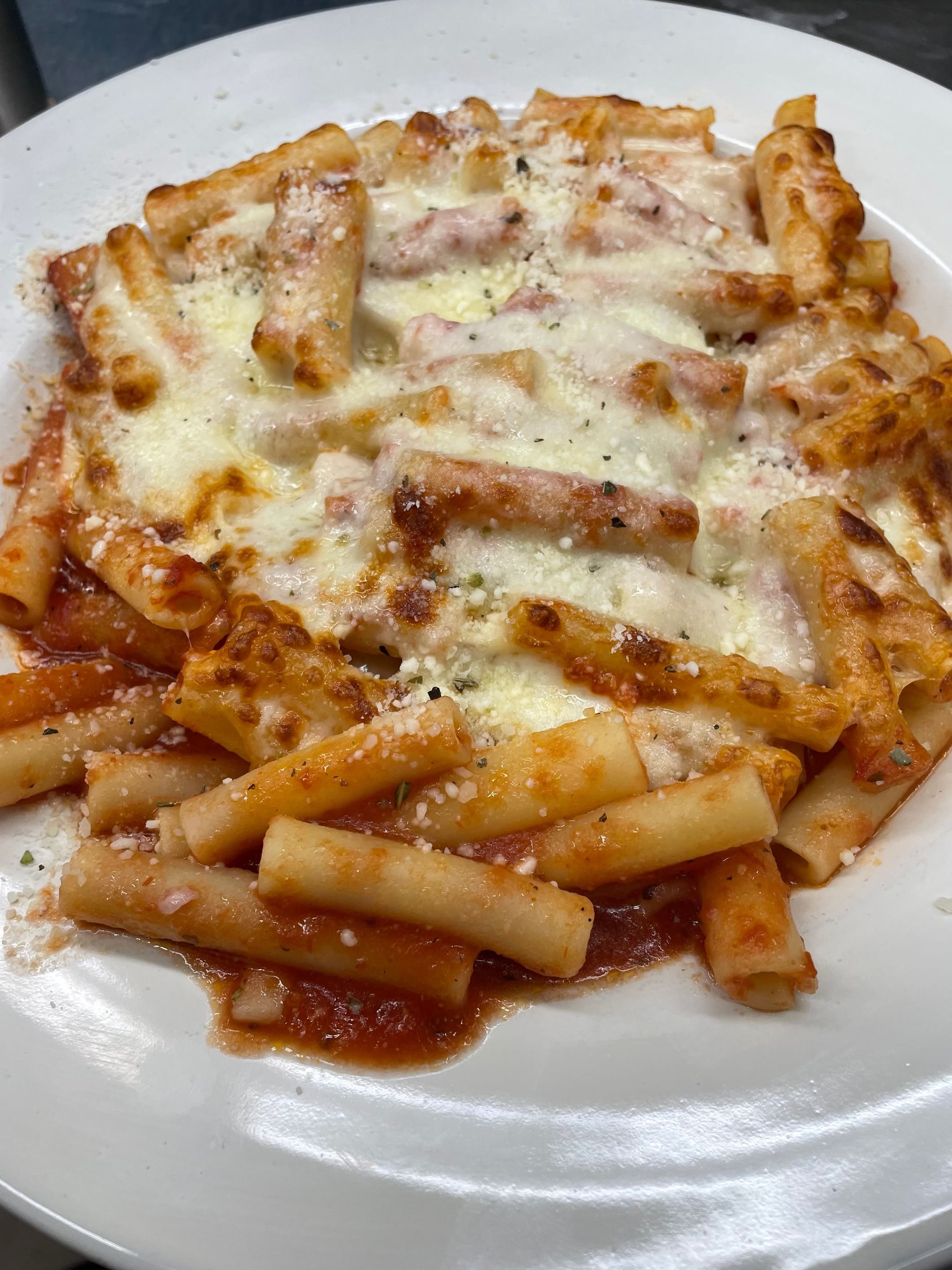 Ziti with mozzarella & tomato sauce baked to perfection in our oven
